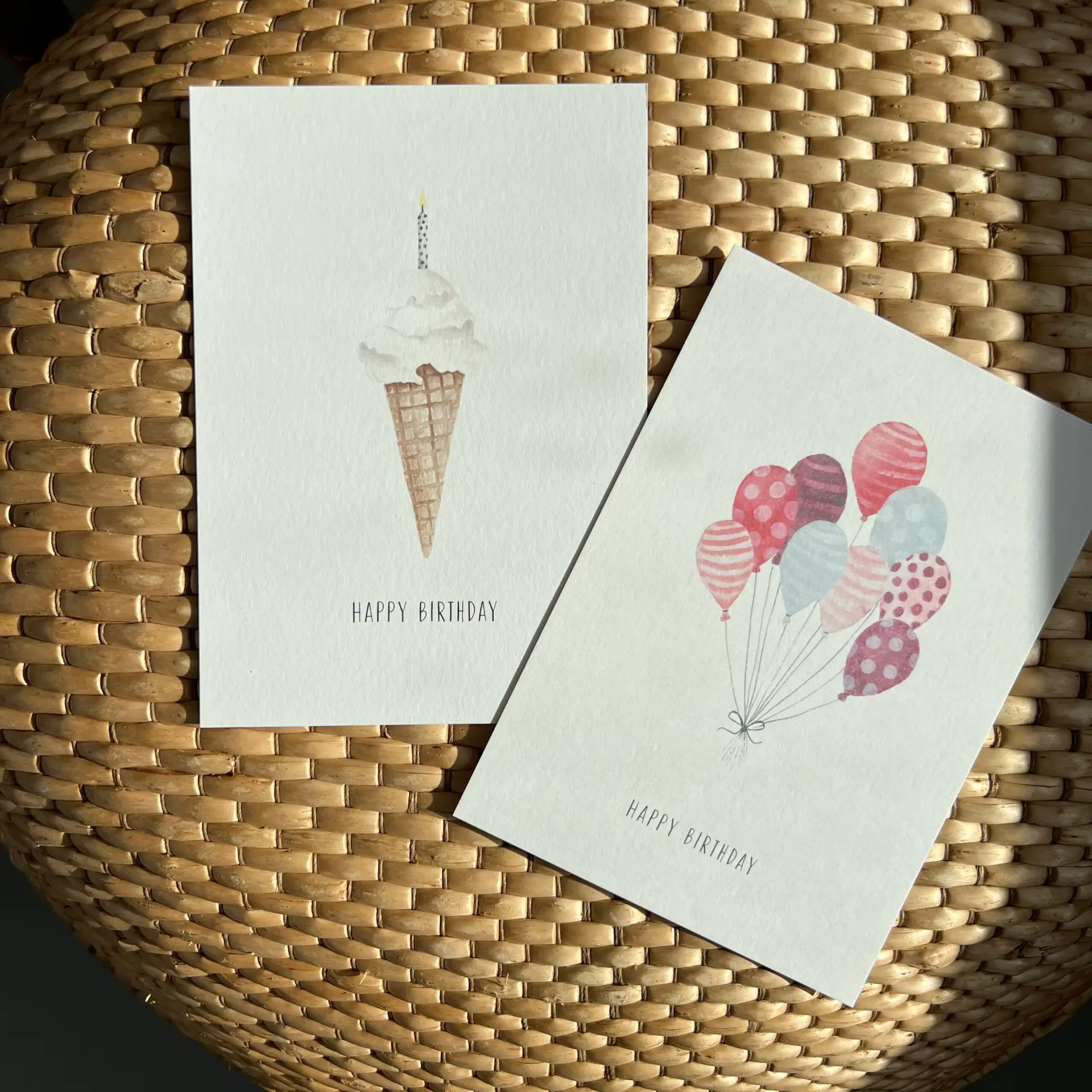 Een vrolijke en unieke verjaardagskaart met een zomers tintje. Op het kaartje staat een handgeschilderd ijshoorntje met een brandend kaarsje in het bolletje ijs, gemaakt met zachte aquarelverf op wit papier. De tekst ‘happy birthday’ staat er subtiel onder in sierlijke letters. De Ansichtkaart IJskaars is perfect om iemand op een originele manier te feliciteren met zijn of haar verjaardag, of om als decoratief kaartje neer te zetten in huis.