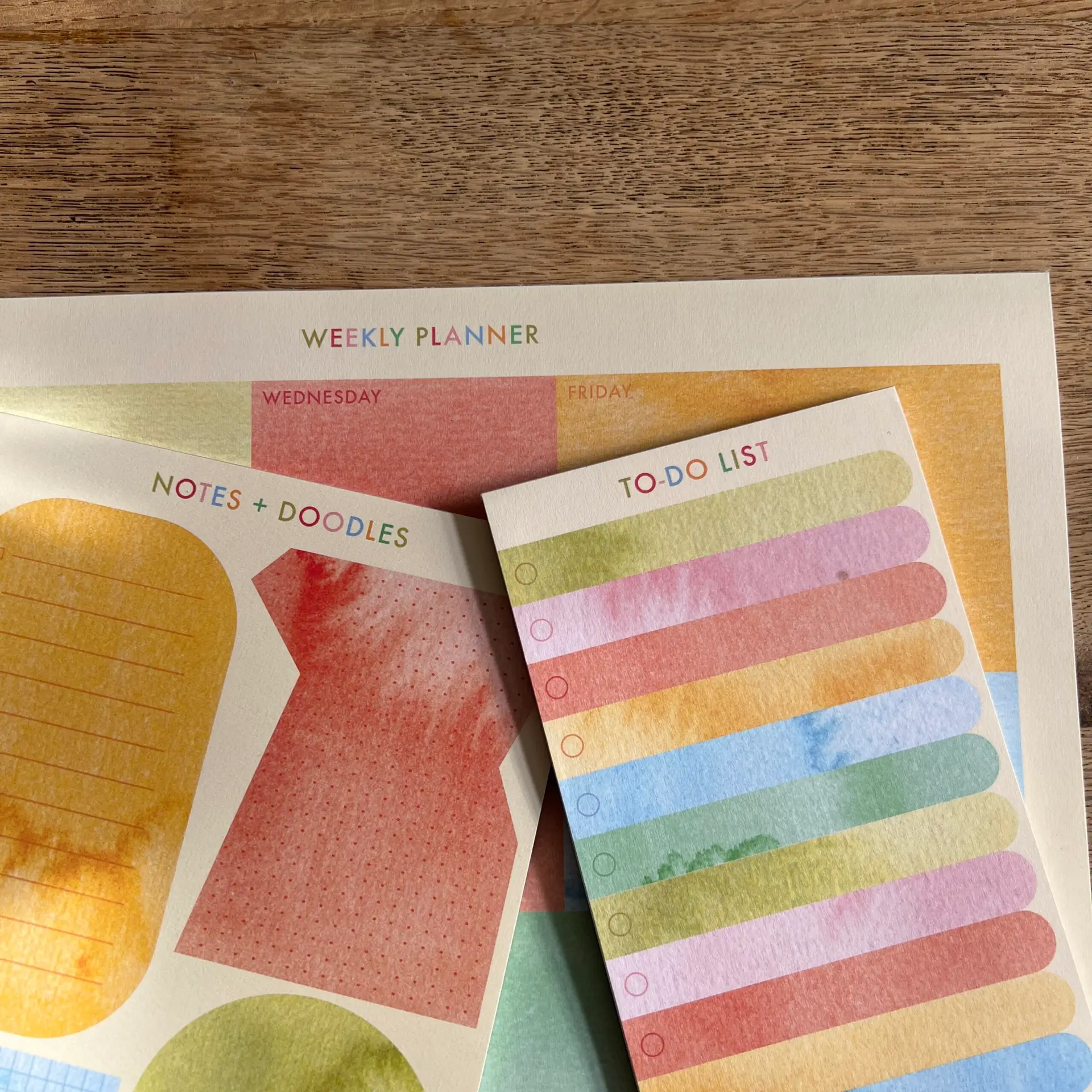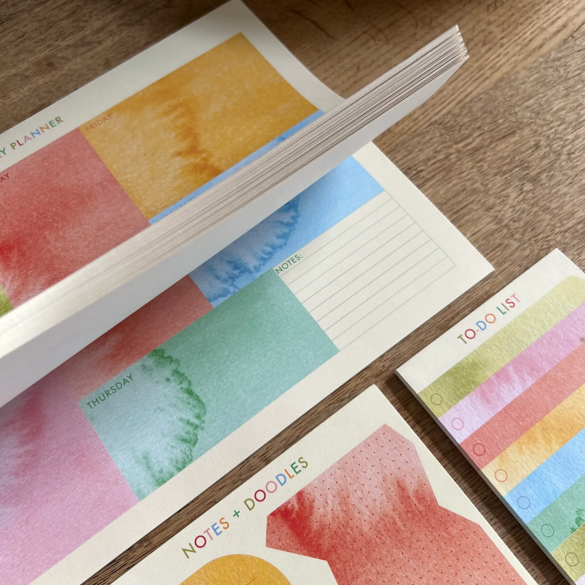 Setje weekplanner en notities Kleurrijk. Met deze overzichtelijke weekplanner en notitieblokjes heb je een elegante set waar je al jouw plannen en to do’s op kan noteren.