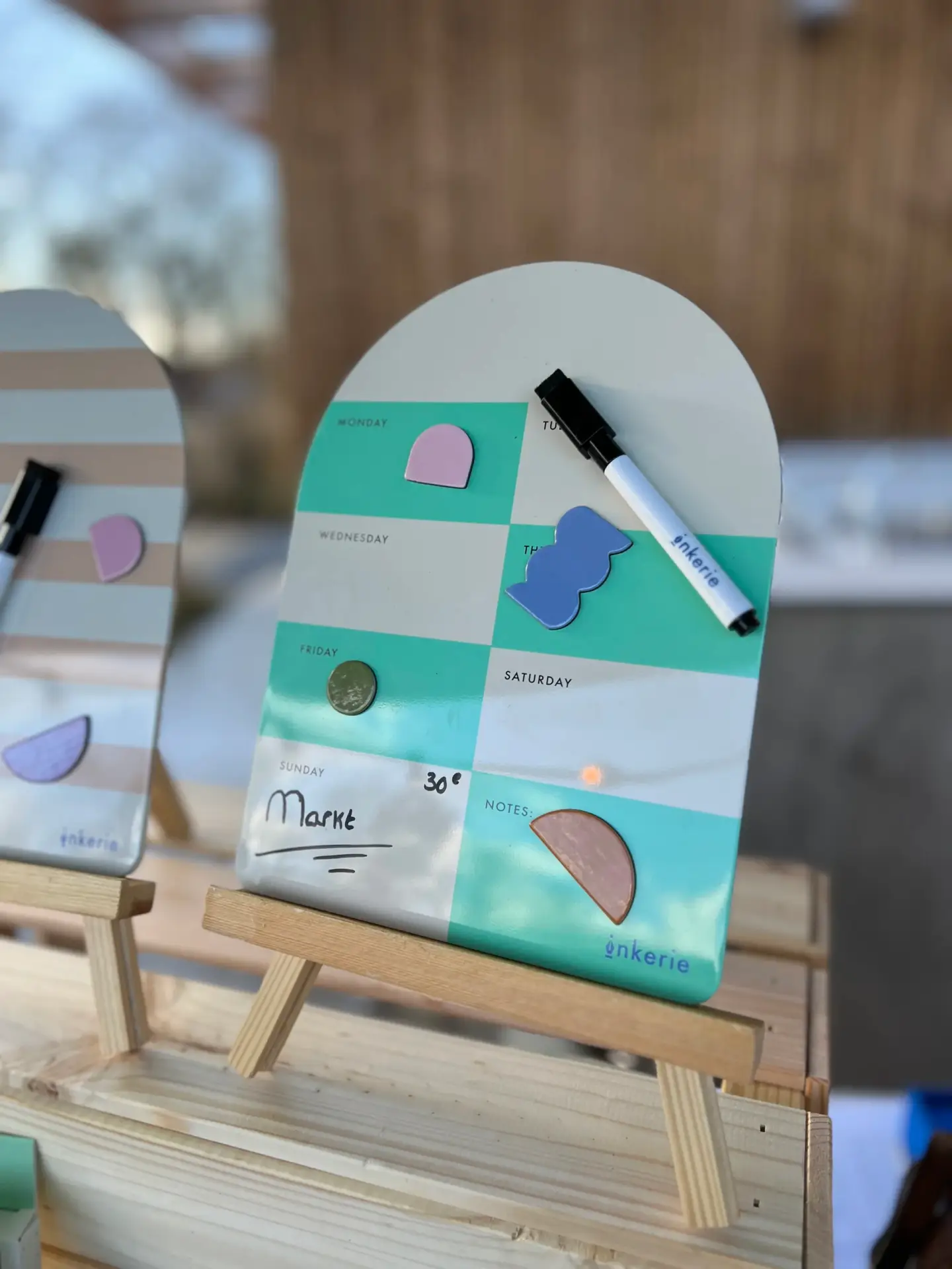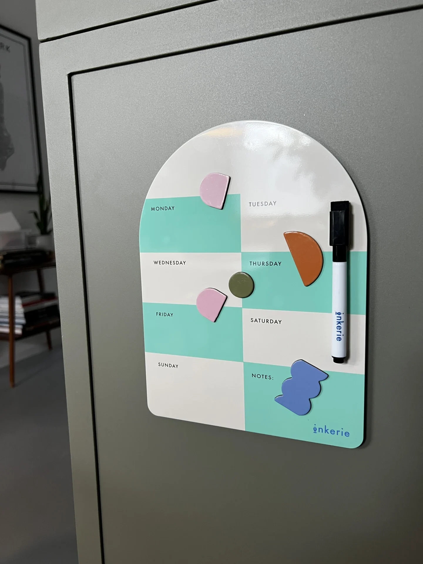 Organiseer je week met het stijlvolle Magnetisch Memobord Groen. Dit bord in zachte mintgroene en licht beige tinten brengt overzicht in huis. De dagen van de week staan duidelijk vermeld, met genoeg ruimte voor notities, afspraken of boodschappen. Dankzij de vier speelse magneten en de droog uitwisbare marker houd je alles netjes bij. Ideaal voor in de keuken of bij je werkplek thuis.