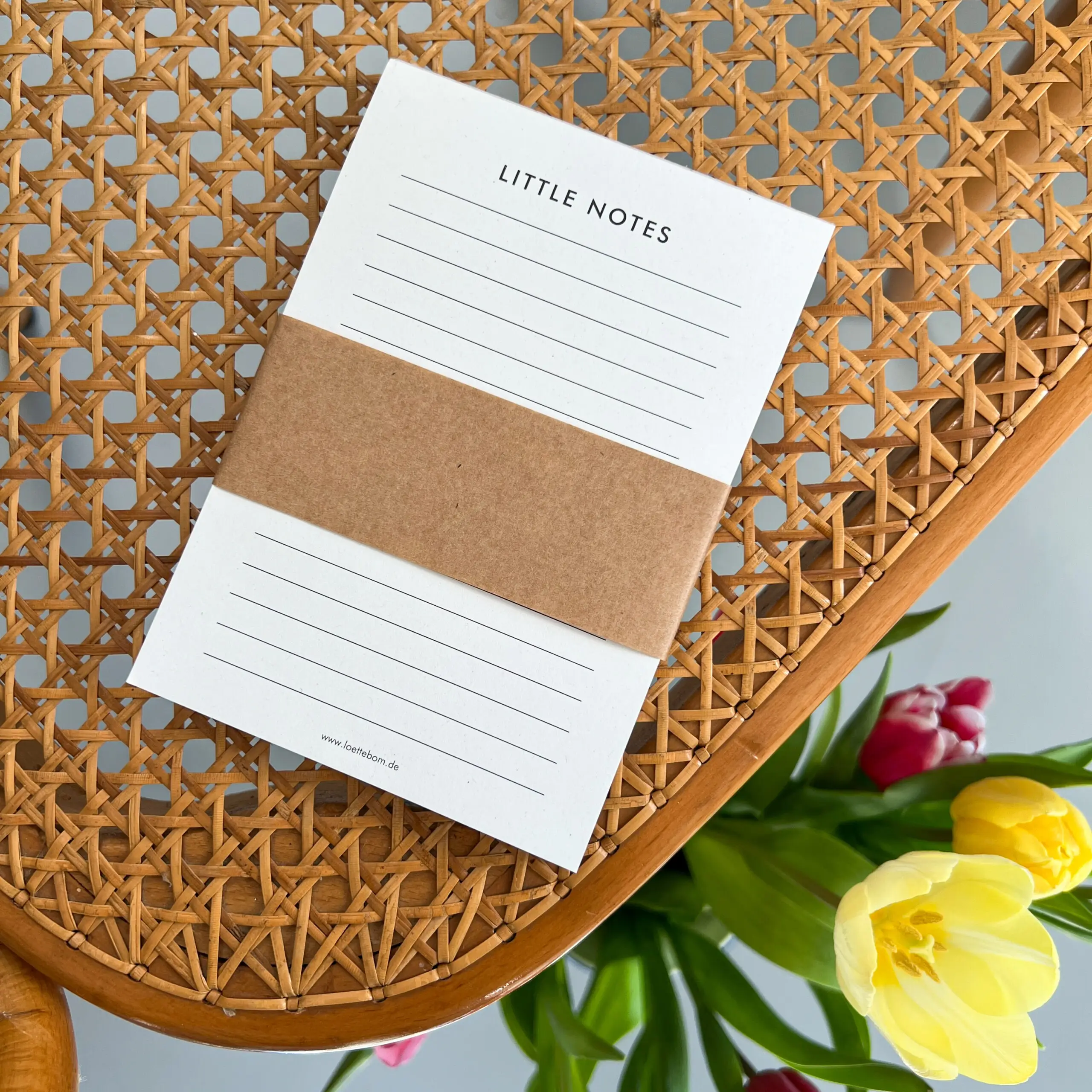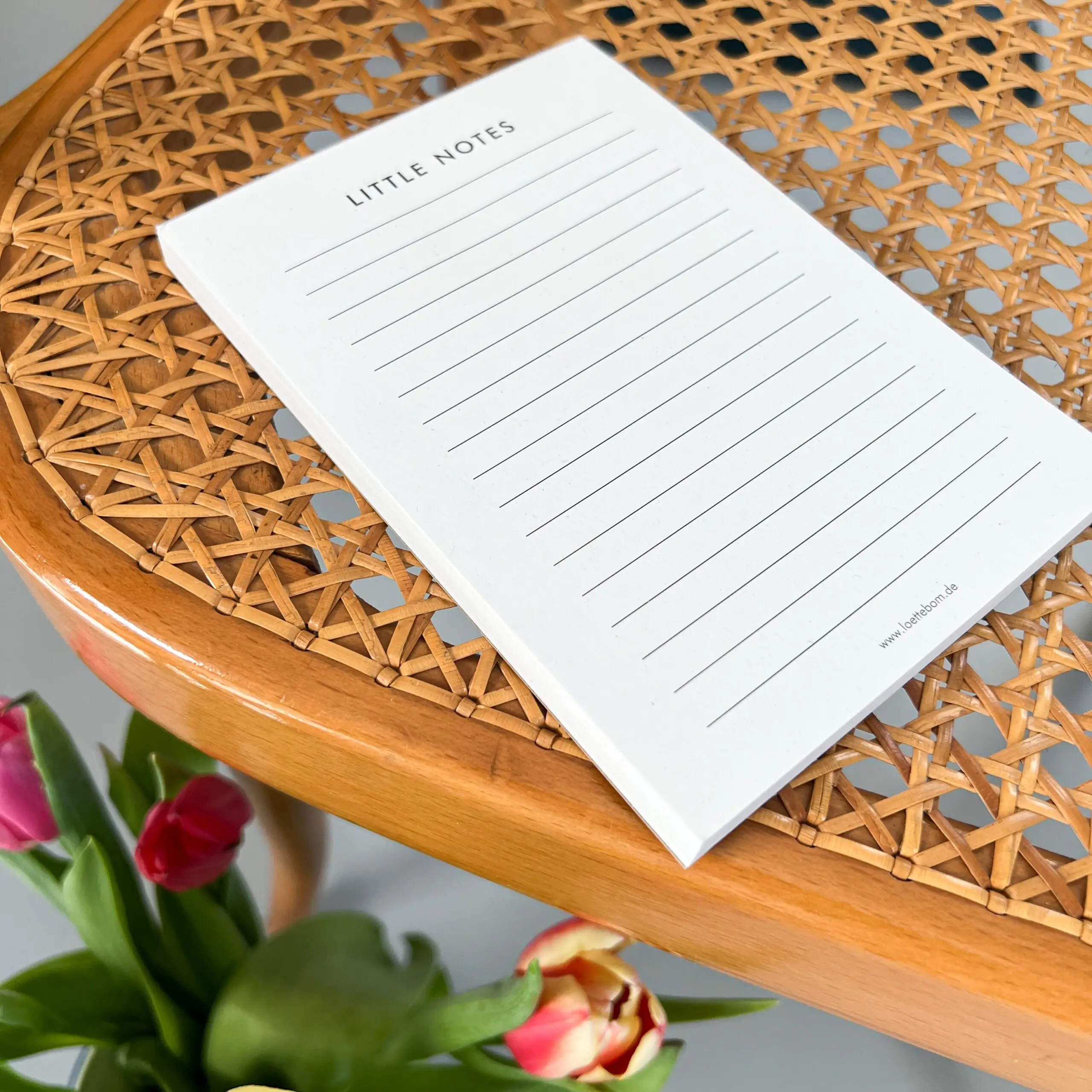 Ontdek ons minimalistische A6 notitieblokje ‘Little Notes’, waar stijl en functionaliteit samenkomen. Dit compacte blokje met fijne lijntjes en de subtiele tekst ‘Little Notes’ is perfect voor het vastleggen van al je ideeën, gedachten en dagelijkse notities. Of je nu onderweg bent of thuis een moment voor jezelf zoekt, met 100 pagina’s aan hoogwaardig papier biedt dit notitieblokje genoeg ruimte voor al je kleine momenten van inspiratie. Een stijlvolle metgezel voor elke dag.