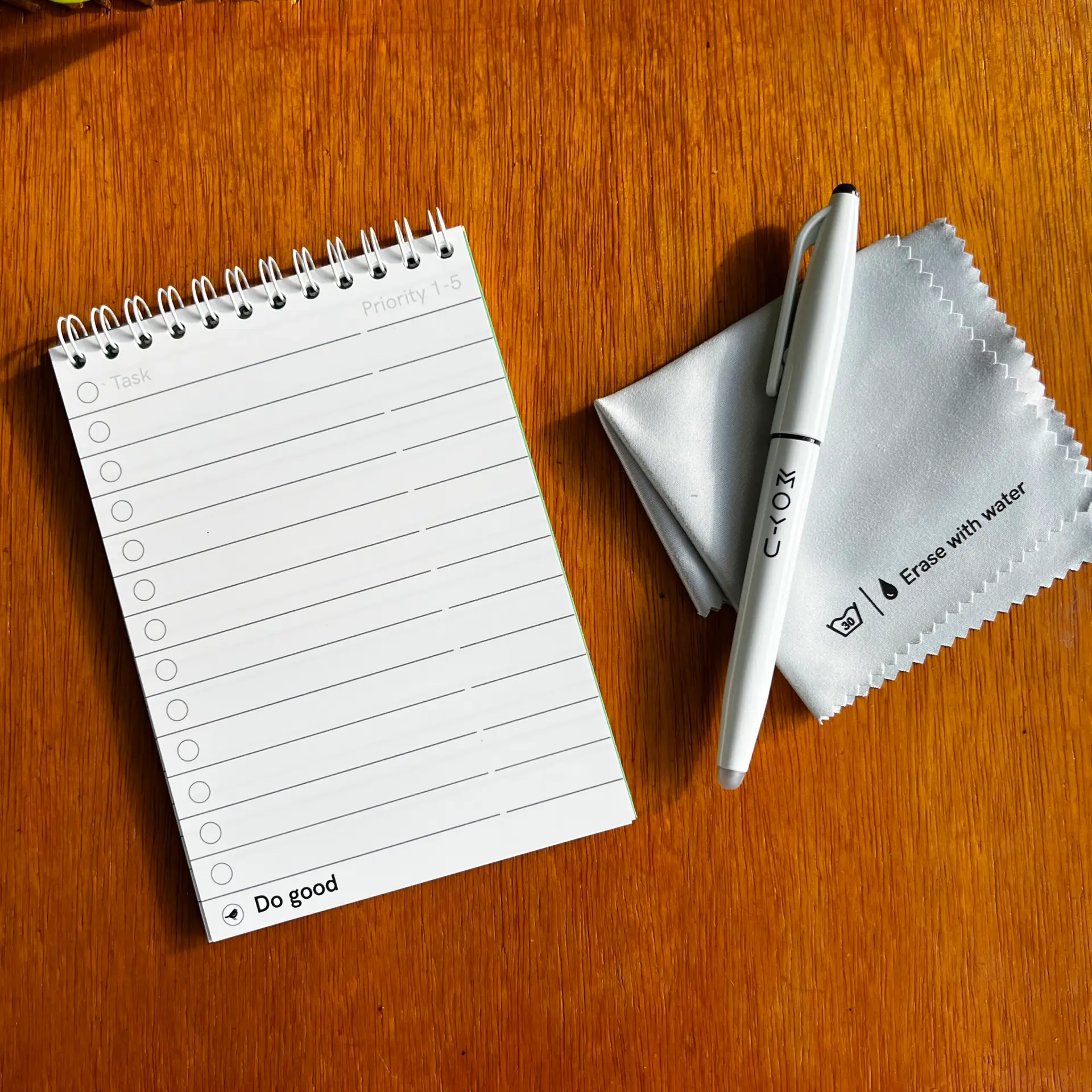 De Frixion-inkt droogt volledig op het gladde steenpapier en veeg je eenvoudig schoon met het meegeleverde doekje. Zo schrijf je eindeloos zonder papier te verspillen. Met dit notitieboekje kies je voor duurzaam gemak in zakformaat en draag je bij aan een groenere aarde, want voor elk verkocht exemplaar wordt een boom geplant in Kenia.