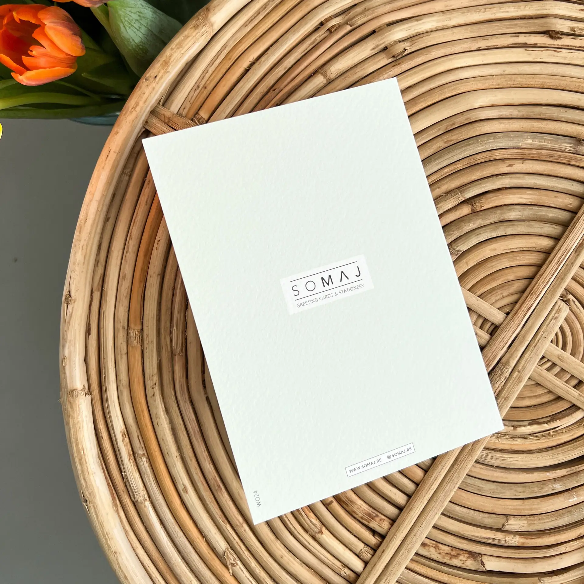 De binnenkant van de kaart is blanco, zodat je alle vrijheid hebt om jouw boodschap op jouw manier te schrijven. Of het nu een lieve wens, grappige anekdote of uitgebreide felicitatie is, deze kaart maakt jouw woorden extra bijzonder.