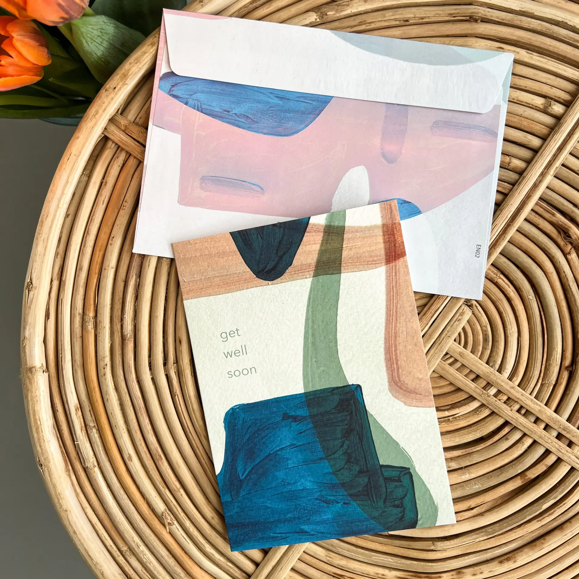 Wenskaart Get Well Soon – Verspreid wat opbeurende warmte met onze Wenskaart Get Well Soon! Dit dubbele A6-kaartje straalt met een mooi, kleurrijk design. De blanco binnenkant biedt ruimte voor jouw persoonlijke woorden van steun. Verpakt met een volledig bedrukte envelop, voegt deze beterschaps kaart een extra speciaal tintje toe aan je goede wensen.