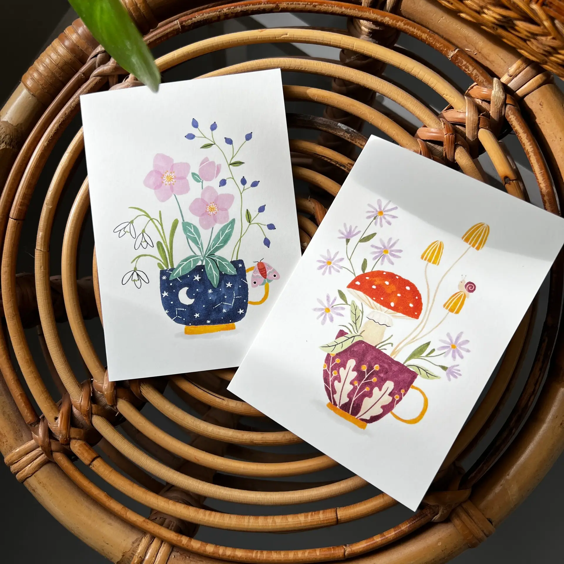 Deel de magie van de winter met deze betoverende Wenskaart Kopje Winter. Op de kaart staat een handgetekend theekopje waar sneeuwklokjes, winterroos en een takje besjes uit groeien. De maan en sterren glanzen op het kopje, terwijl een nachtvlinder op het oortje rust. Deze blanco kaart is ideaal om iemand te feliciteren, bedanken of een warme groet te sturen. Of zet hem op een plekje in huis en geniet zelf van de winterse sfeer. Een klein kunstwerkje vol charme.
