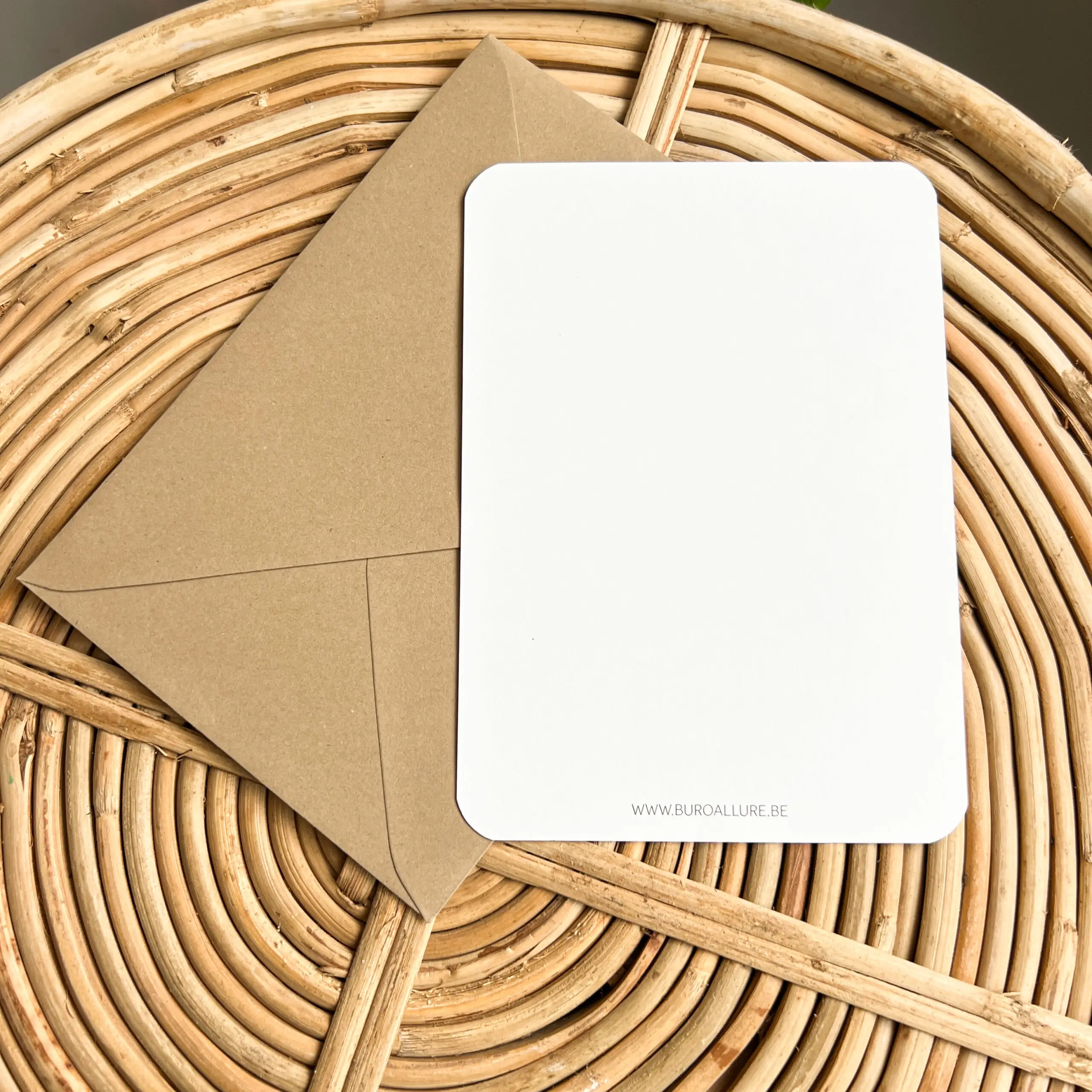 De binnenkant van de kaart is blanco, zodat je alle vrijheid hebt om jouw boodschap op jouw manier te schrijven. Of het nu een lieve wens, grappige anekdote of uitgebreide felicitatie is, deze kaart maakt jouw woorden extra bijzonder.