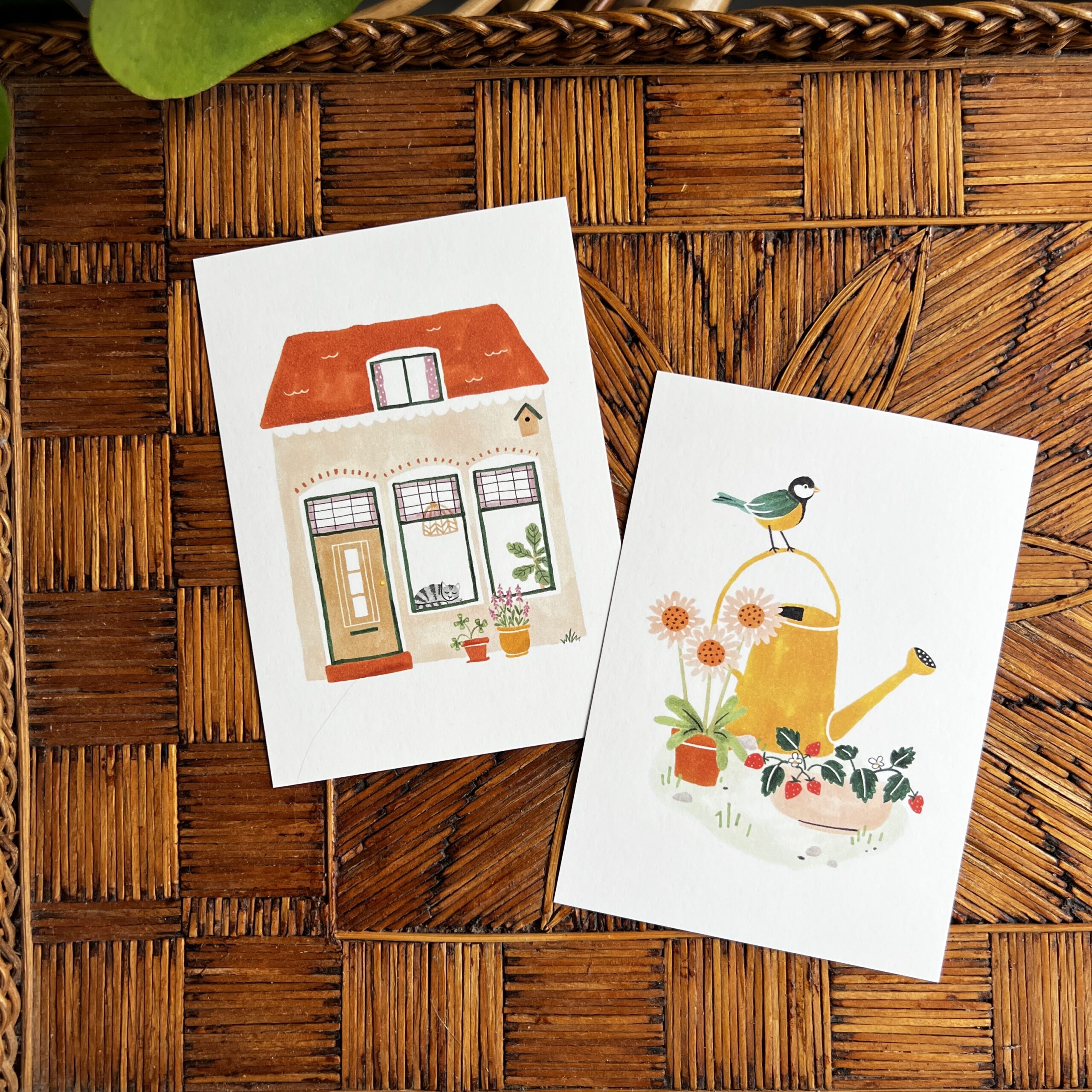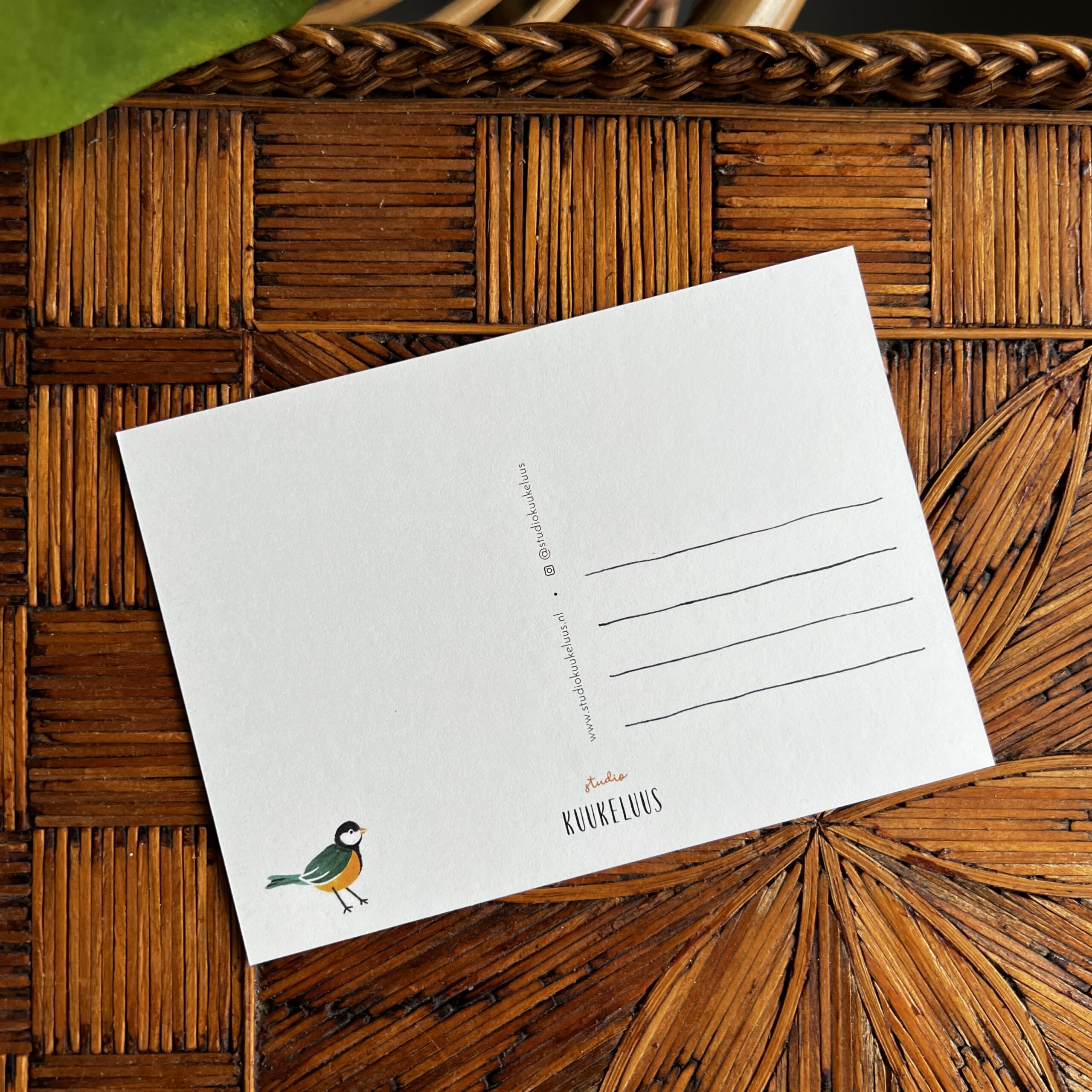 Een zonnig kaartje met koolmeesje waarop bloeiende bloemen en rijpe aardbeien samen een vrolijk tafereel vormen. Op de gieter is net een nieuwsgierige koolmees neergestreken, omringd door kleur en zomerlicht. Dit handgetekende kaartje straalt warmte en blijheid uit en is perfect om iemand op te vrolijken of een mooi plekje in huis te geven. Een ansichtkaart zonnig koolmeesje dat direct een glimlach oproept.