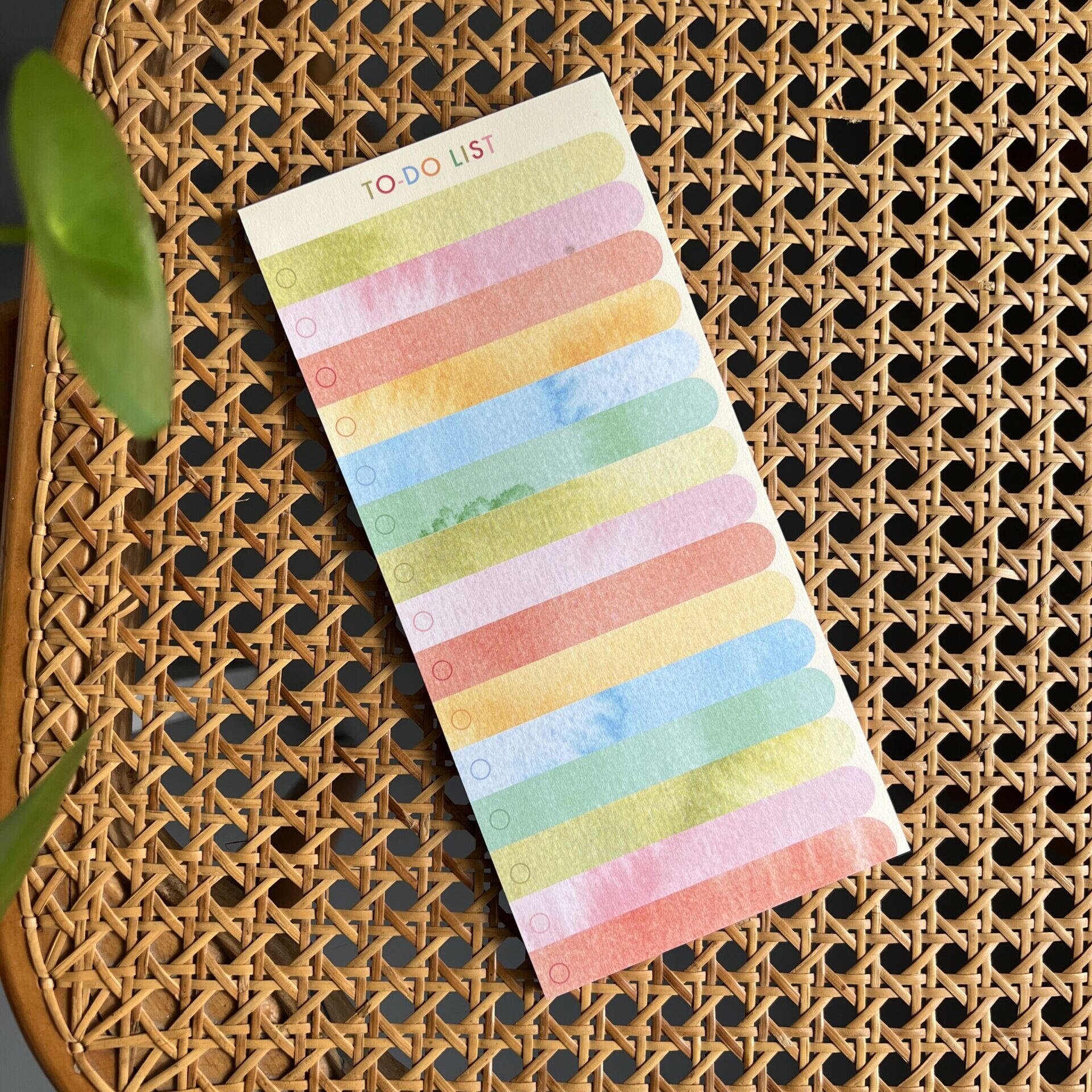 Hou grip op je dag met De Waterverf To Do. Dit kleurrijke notitieblokje is ideaal om al jouw taken in een overzicht te noteren en niets meer te vergeten. Het langwerpige formaat maakt het perfect voor je bureau of om makkelijk mee te nemen, zodat je altijd je takenlijst bij de hand hebt. De handgeschilderde waterverfdetails geven het blokje een vrolijke uitstraling, waardoor plannen een plezier wordt. Met 50 pagina’s is dit notitieblokje jouw praktische en stijlvolle hulp voor elke dag.